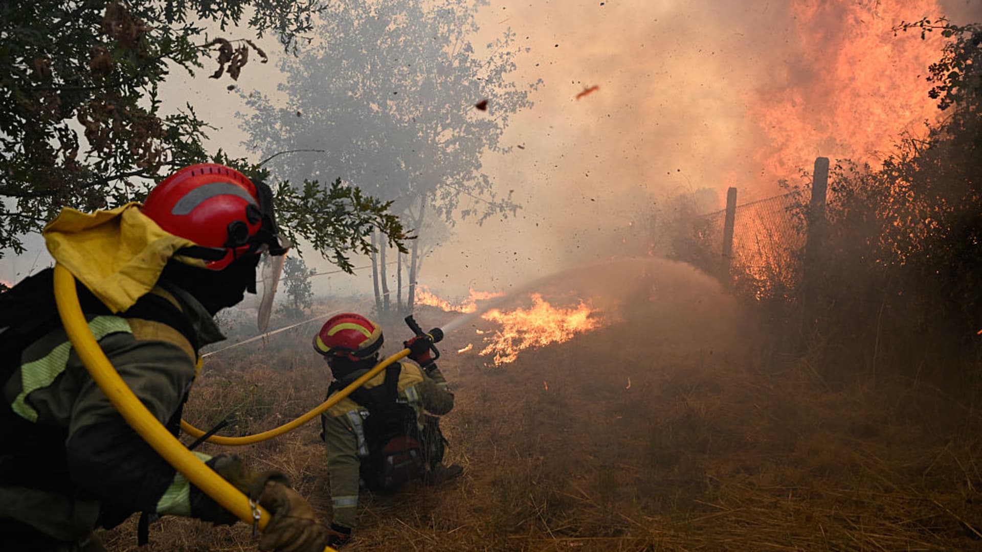 A firefighter falls on the ground while working to extinguish a wildfire in San Cibrao das Viñas, outside Ourense, northwestern Spain, on August 12, 2025.